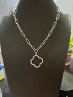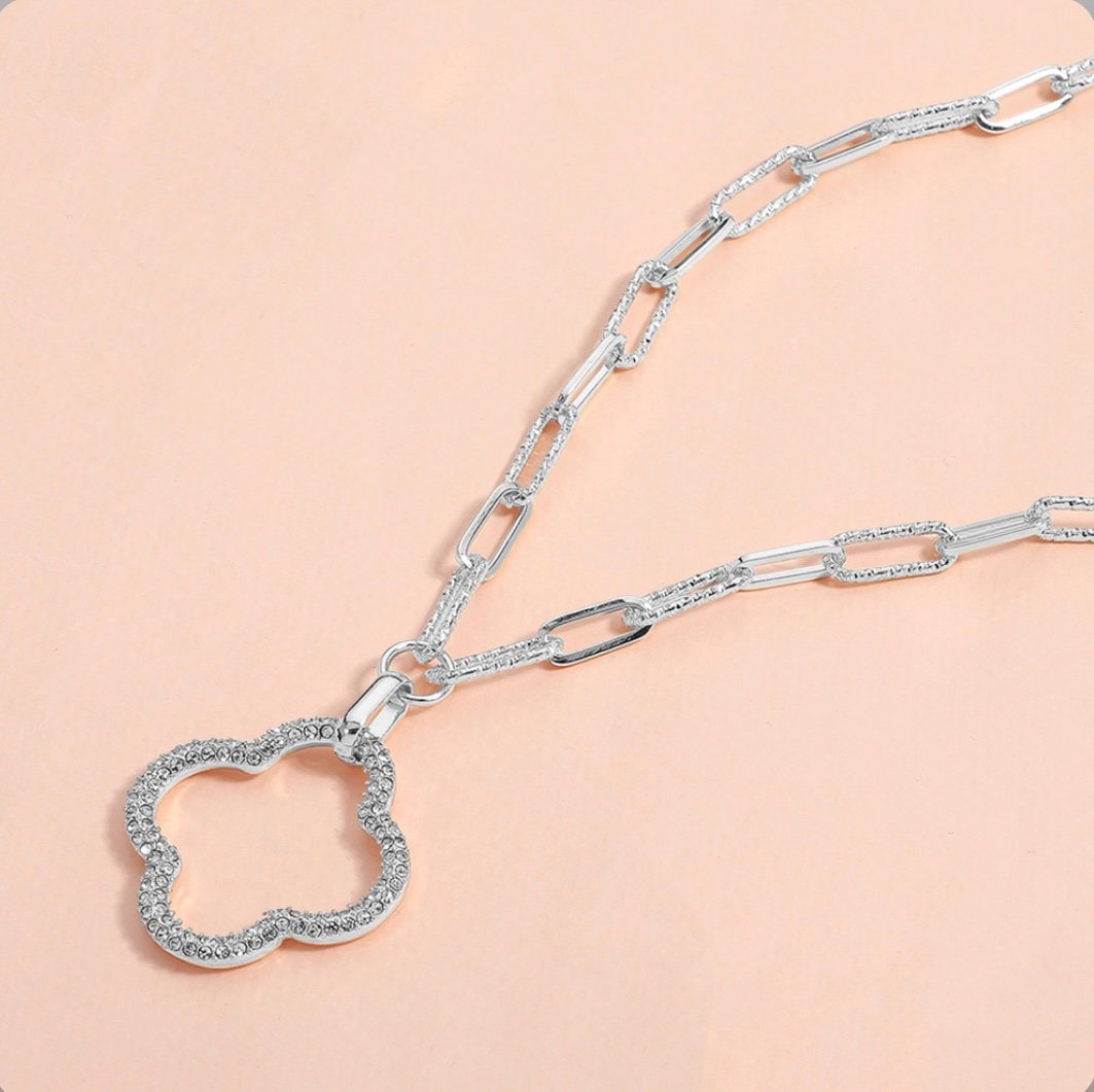 Beautiful silver clover necklace. Embellished with rhinestones. Classy paper clip chain. You’ll turn heads with this piece. Measures 17.5in.+3.5in extender.