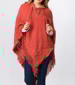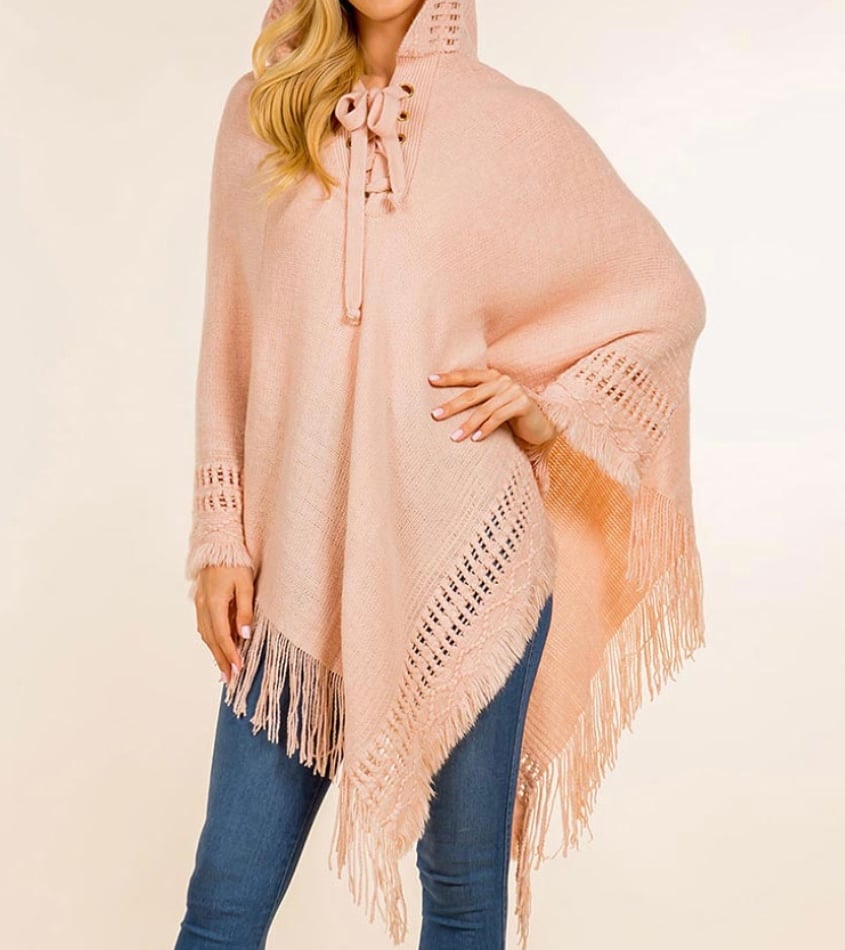• Soft knit poncho with a cozy hood, lace-up neckline, and stylish fringe trim. Features open sides for relaxed layering and textured hem accents. A perfect blend of comfort and chic for any casual outfit. One sized. 100% acrylic.