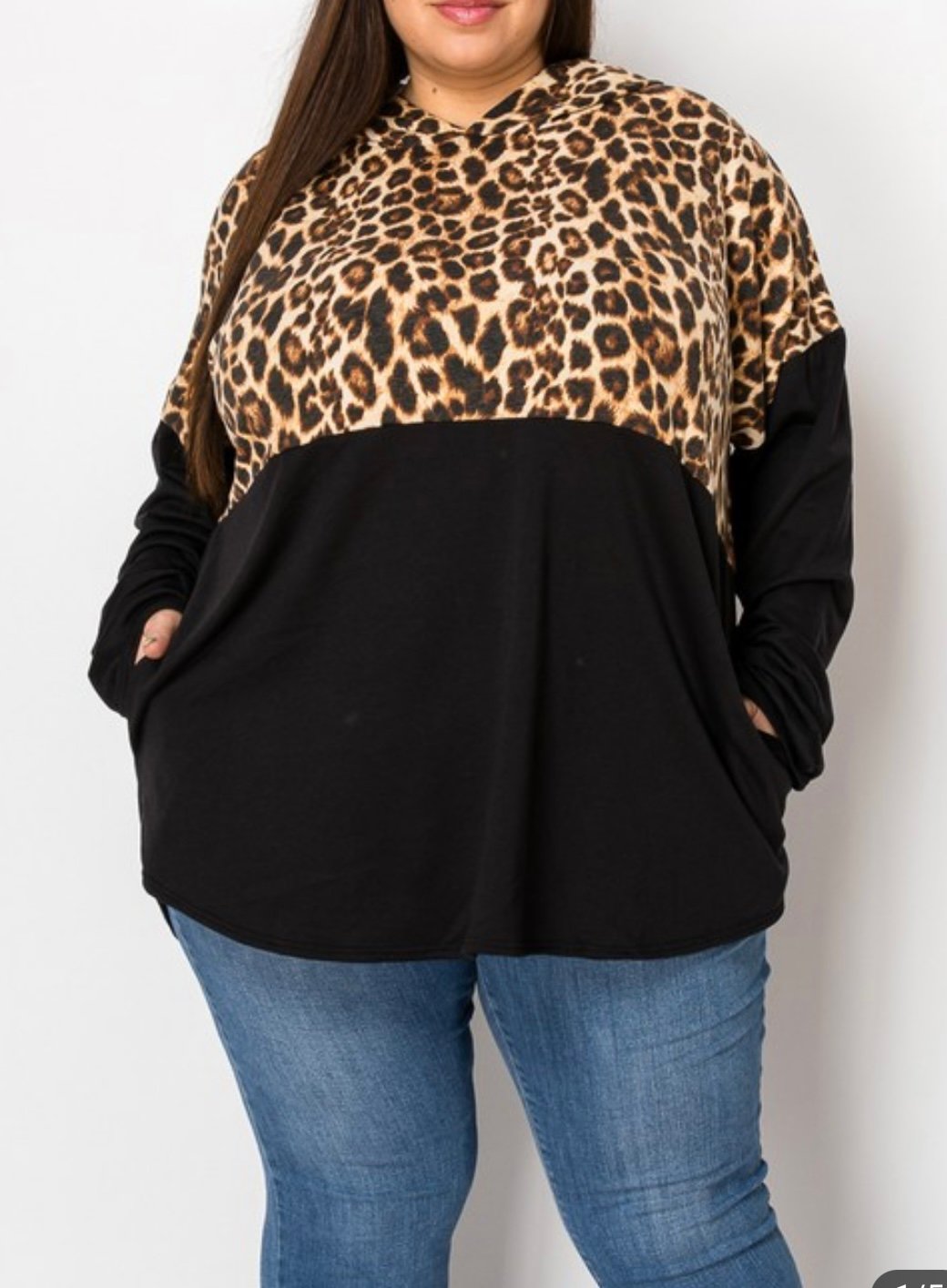 Beautiful Leopard hoodie! Has pockets. Super soft and comfortable. Great for the fall. 90% polyester 7% rayon 3% spandex.