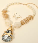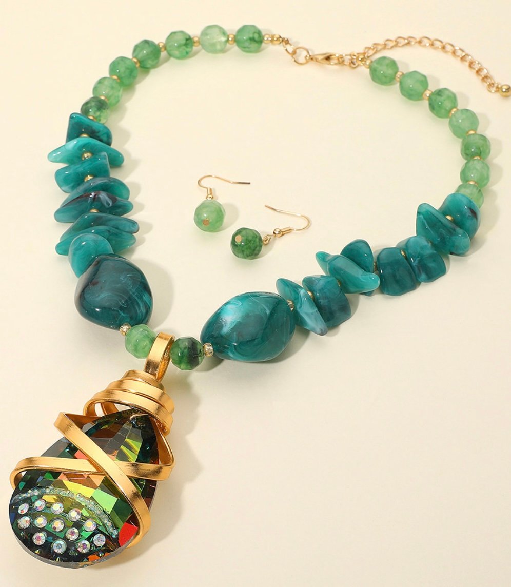 Absolutely Stunning! Turn heads with this striking beaded statement necklace, featuring an artistic pendant wrapped in metallic accents paired with matching earrings. Ideal for special occasions or elevating everyday outfits. Lead and nickel compliant.