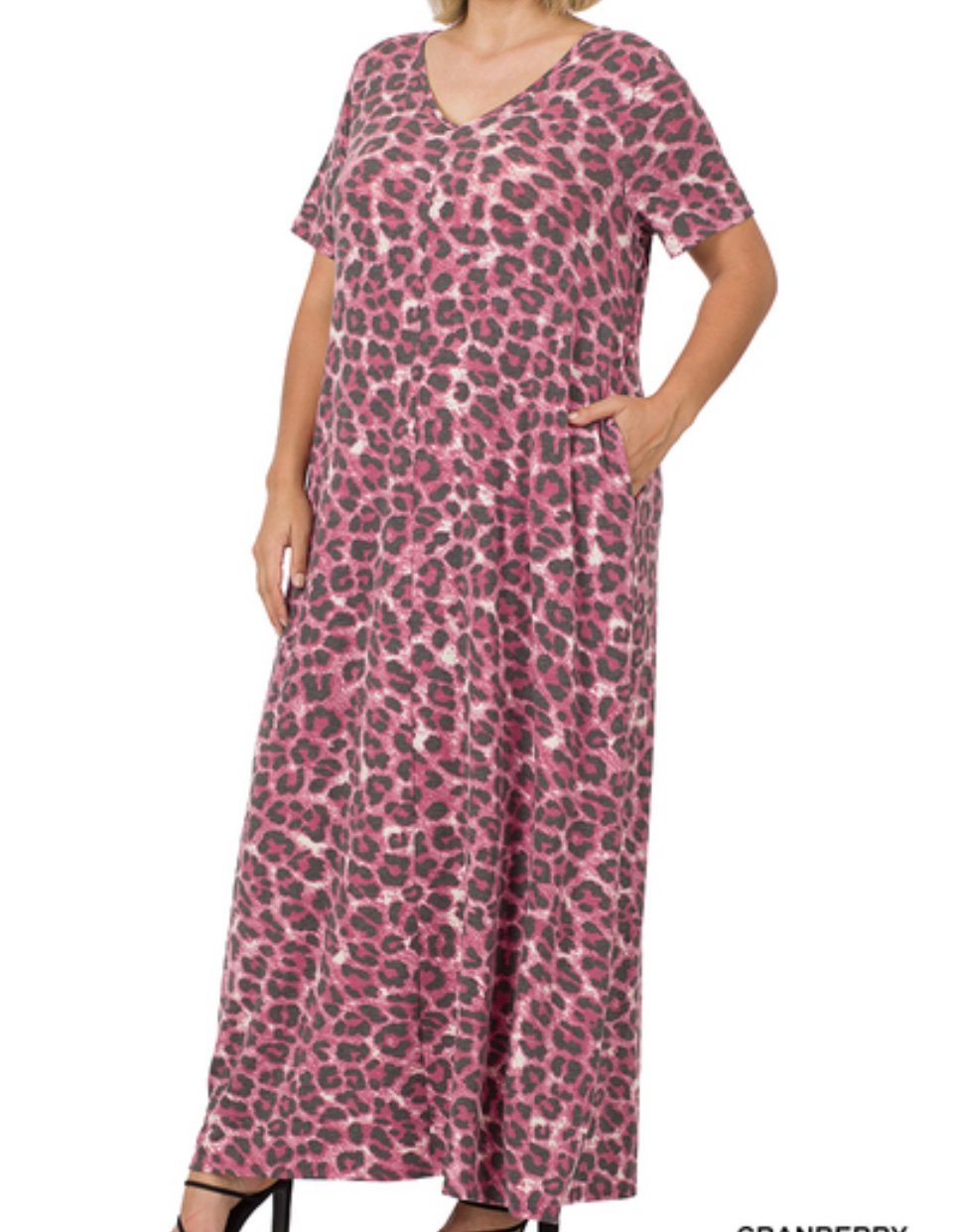 Beautiful pink leopard maxi dress. Great for dressing up or down. Comes with pockets! 95% polyester 5% spandex. Available in 1X, 2X, and 3X.